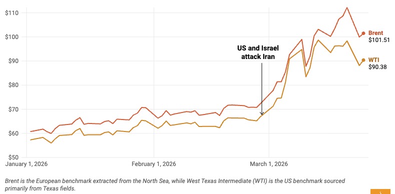 The primary driver is the escalating geopolitical conflict in the Middle East, particularly the disruptions around the Strait of Hormuz, which has severely constrained global oil supplies and caused crude prices to surge.